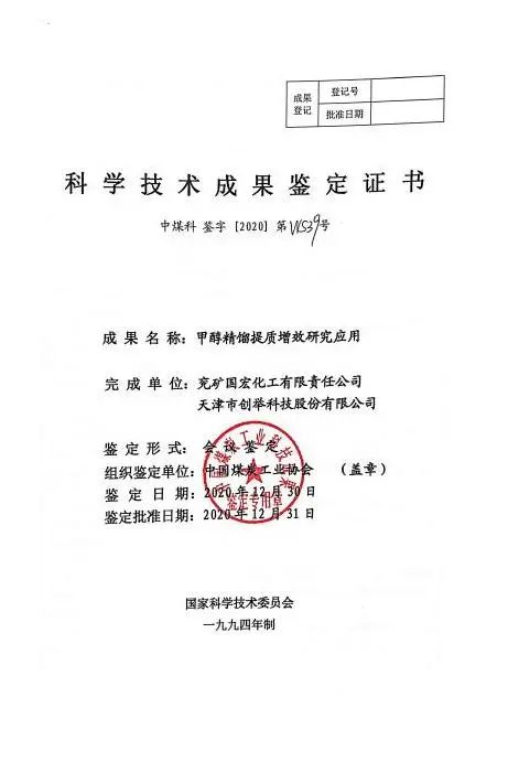 2020年底,中國煤炭工業(yè)協(xié)會組織有關(guān)專家,對國宏公司及創(chuàng)舉科技共同申報的“甲醇精餾提質(zhì)增效研究應(yīng)用”技術(shù)進行科學(xué)技術(shù)成果鑒定。經(jīng)專家鑒定,該項技術(shù)成果達到“