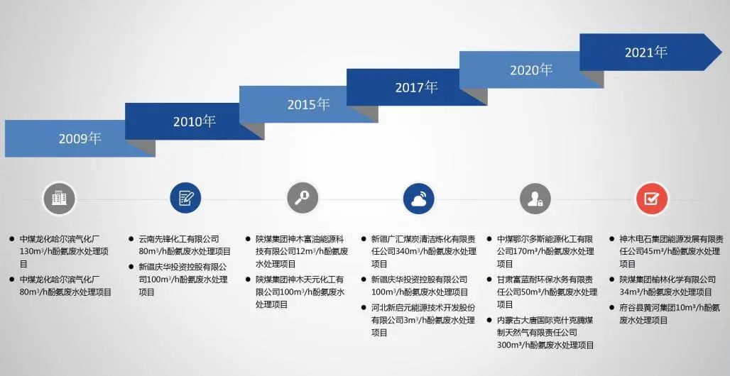 天津市創(chuàng)舉科技股份有限公司從2009年為中煤龍化哈爾濱氣化廠—130m³/h酚氨廢水預(yù)處理工段,成功改造脫酸脫氨塔后,正式步入酚氨廢水預(yù)處理領(lǐng)域的研究與開發(fā)行列中。由此開始,創(chuàng)舉公司先后參與了國內(nèi)諸多大型煤化工酚氨廢水預(yù)處理的項目建設(shè),截止到2022年,已為20余家企業(yè)提供了上百臺設(shè)備及核心內(nèi)件。